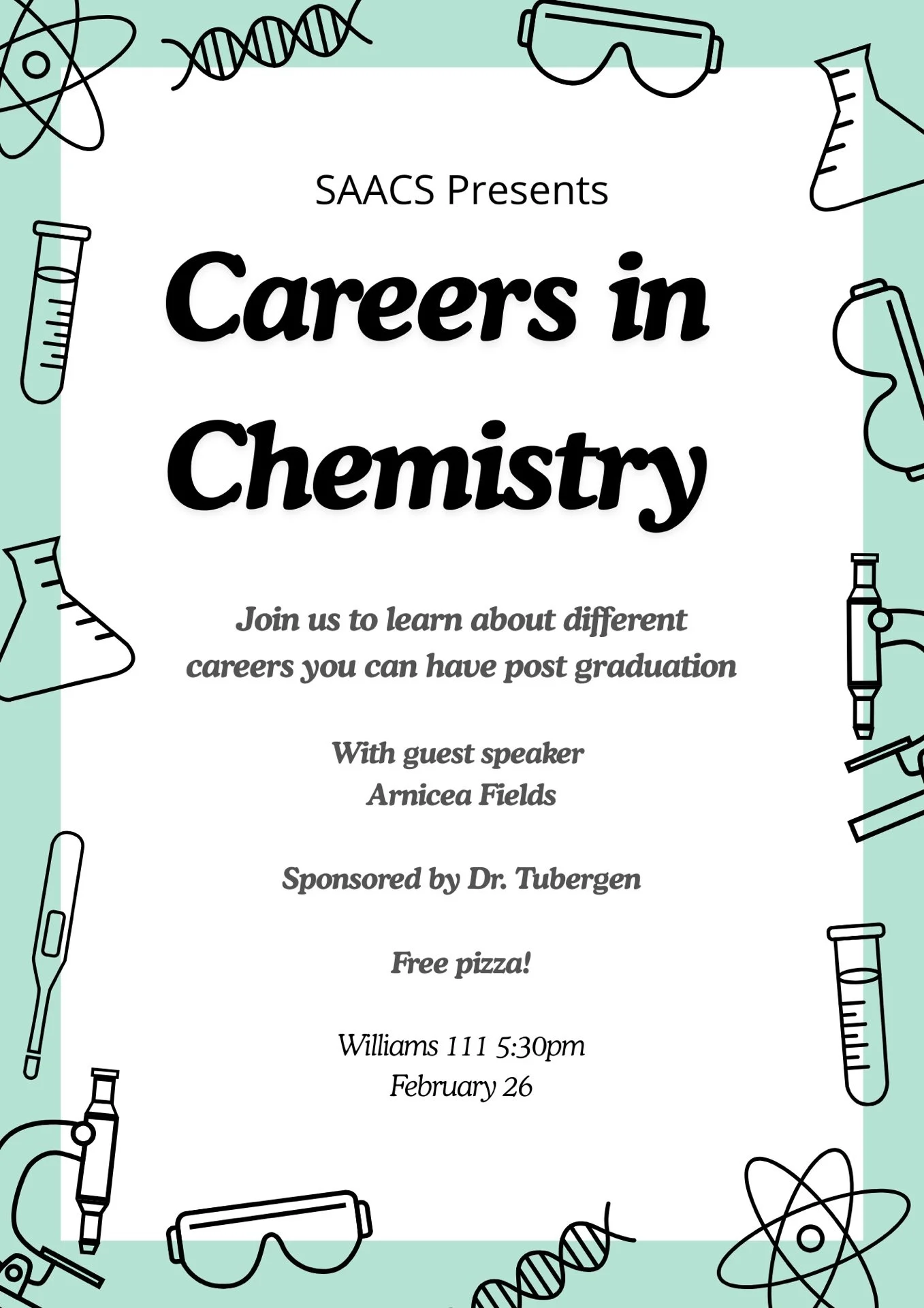 Join SAACS and Dr. Tubergen to investigate career pathways you can pursue after graduation! Guest speaker Arnicea Fields will be answering your questions, and pizza will be served. This will be held on February 26 at 5:30pm in 111 Williams Hall.