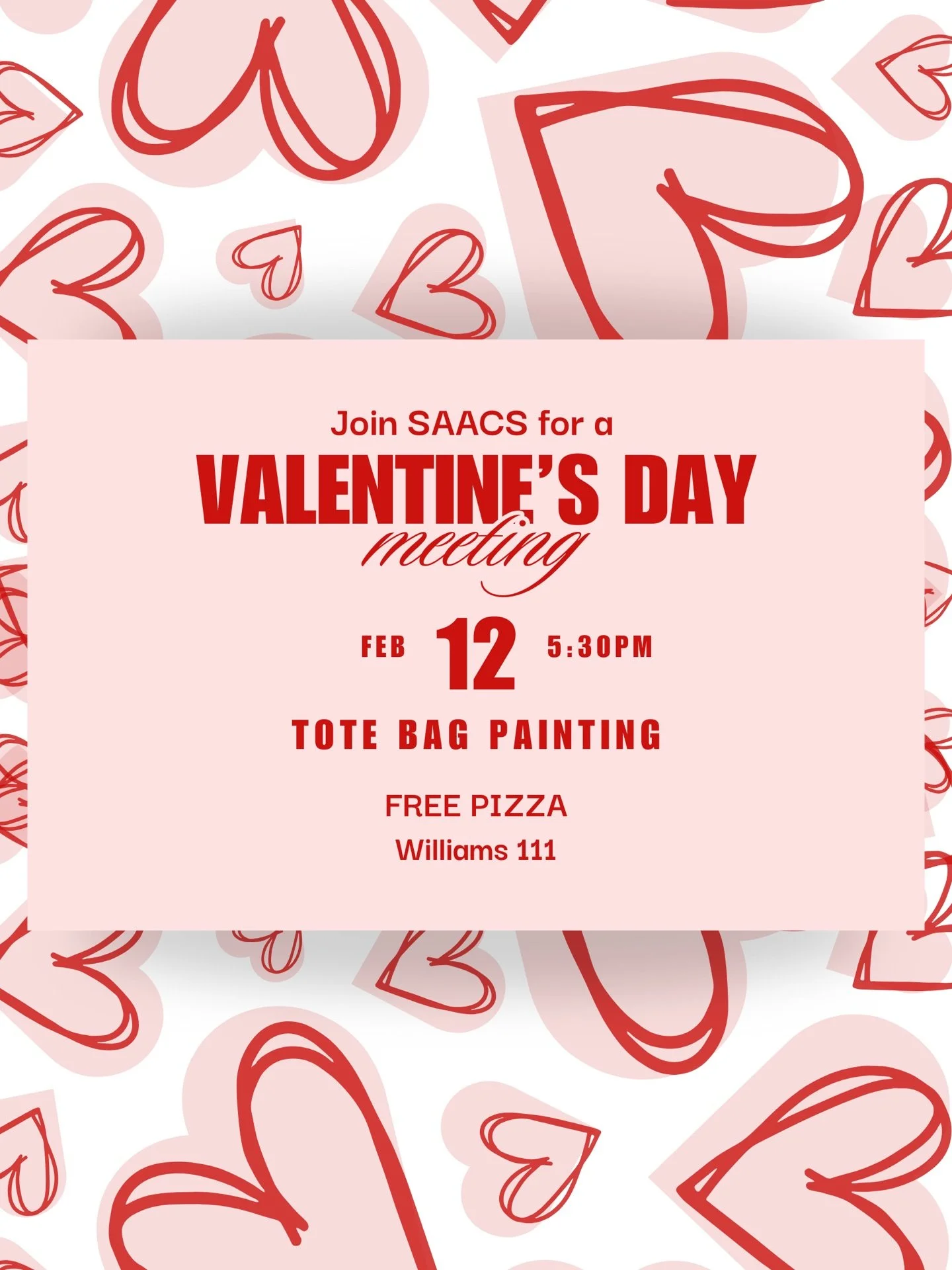 SAACS is hosting its annual Valentine’s Day meeting! Join the group for pizza and tote bag painting on February 12 at 5:30pm in 111 Williams Hall.