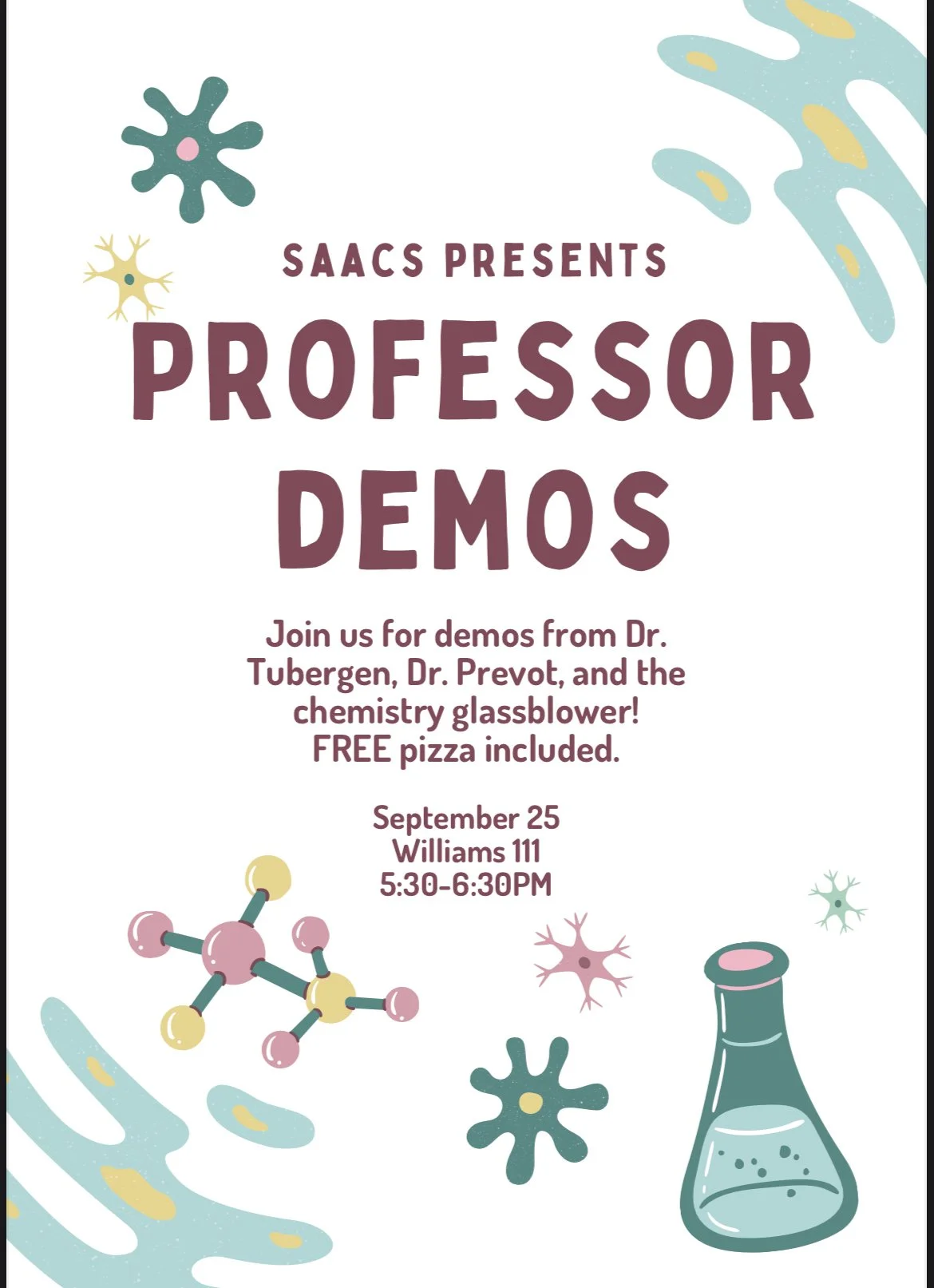 Join us for our popular Professor Demo Night! We will meet in Williams Hall Room 111 where there will be free pizza and then we will move into the labs for demos from Dr. Tubergen, Dr. Prevot, and the chemistry glassblower! It will be a great time, so bring your friends!