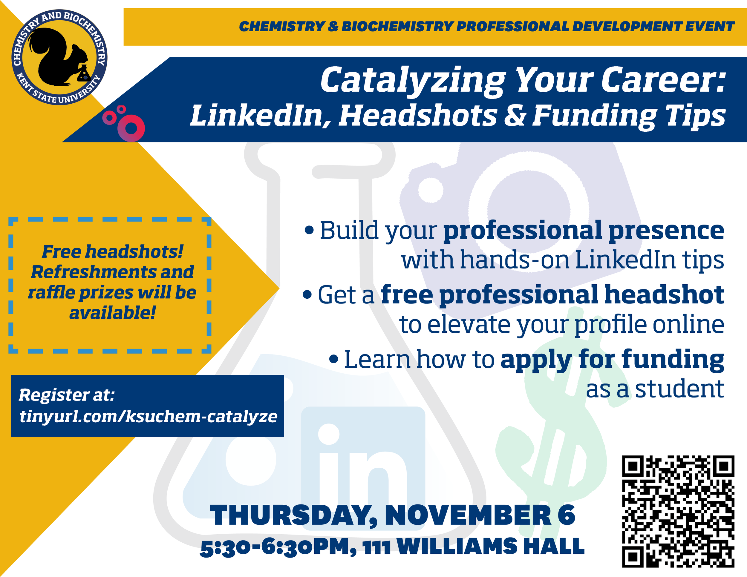 Join us for Catalyzing Your Career, a departmental event where attendees will learn how to best utilize LinkedIn, hear about funding opportunities for undergraduate and graduate students, and get a free headshot taken for their profile! This event is free, and pizza will be served, but registration is required.