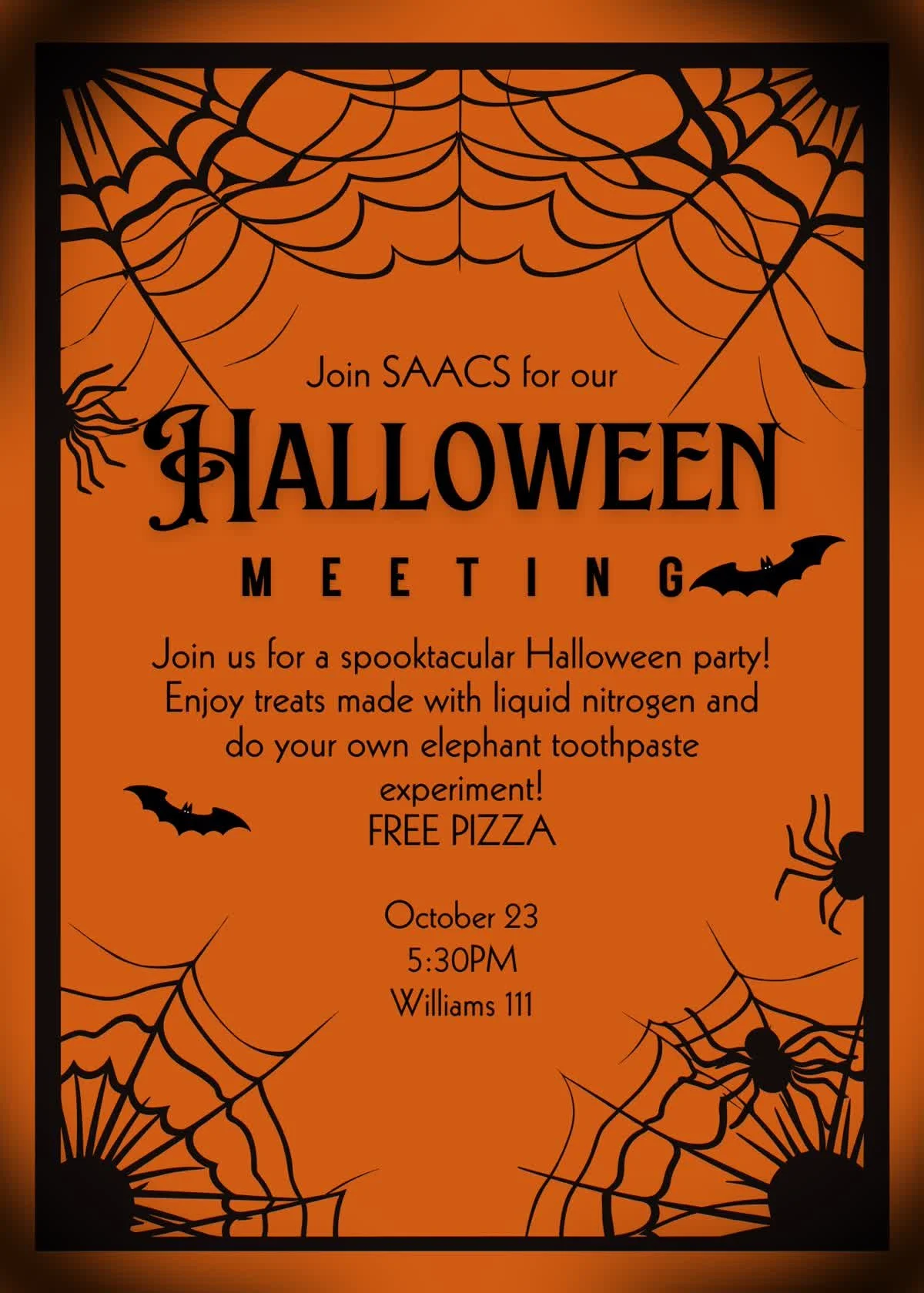 Join the SAACS group as they hold their annual Halloween meeting, complete with pizza and liquid nitrogen treats!