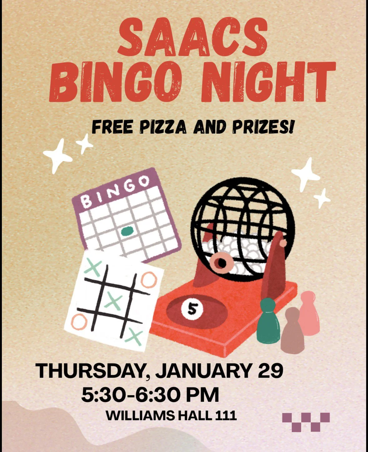 Our first meeting of the semester will be Thursday, January 29th at 5:30pm in Williams Hall 111. We will be playing bingo and there will be prizes for winners and free pizza for everyone, so bring your friends!